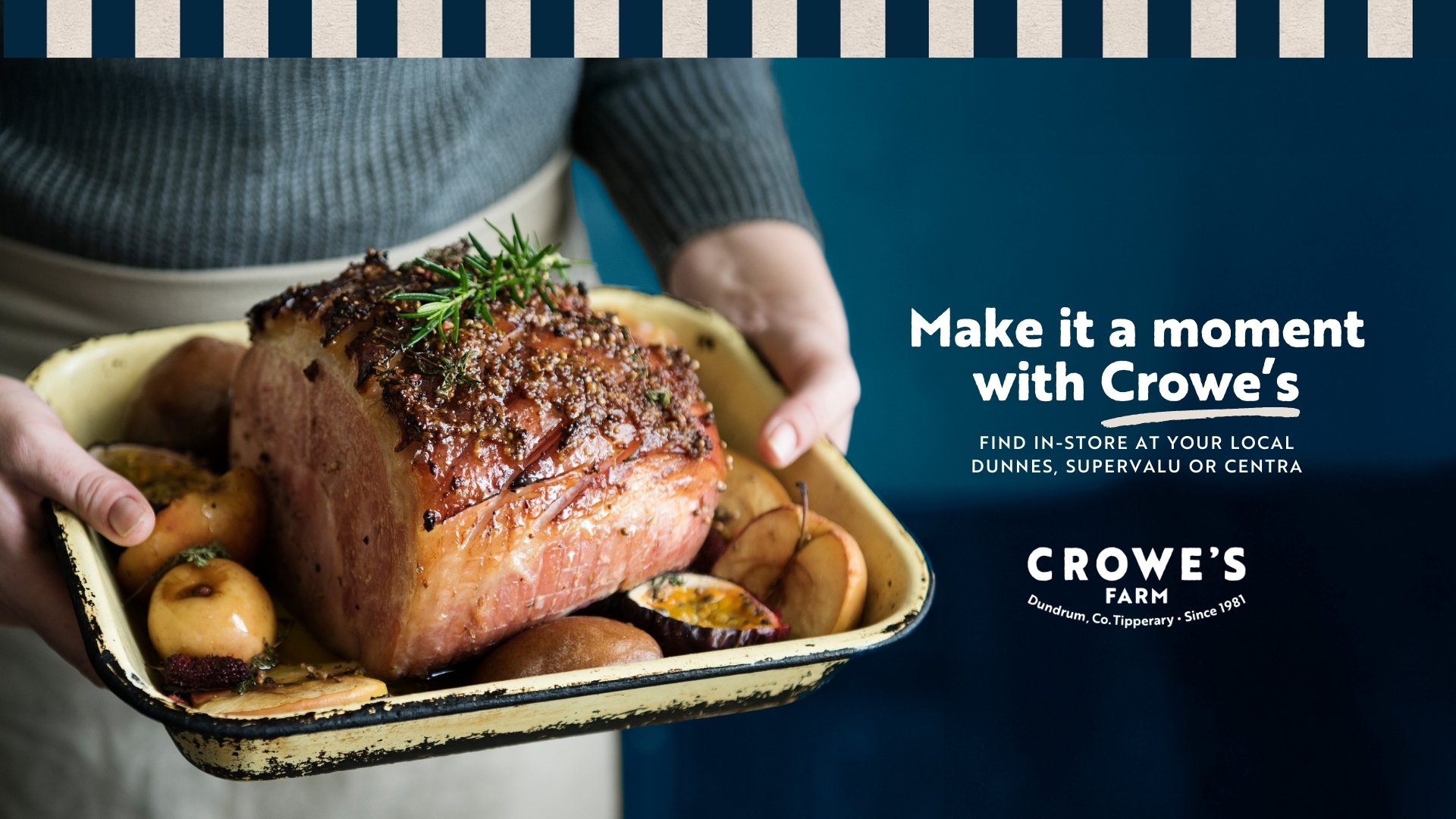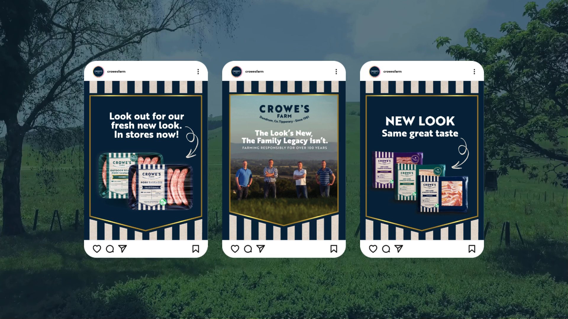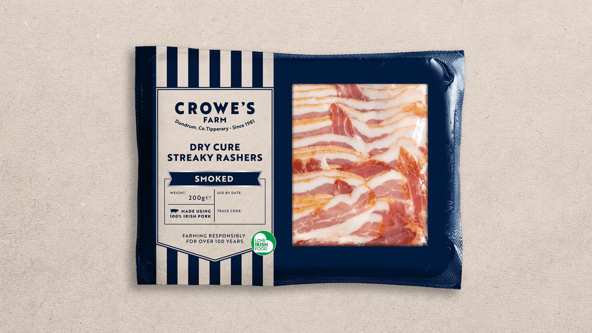 With over 100 years of farming heritage in Tipperary’s Golden Vale, the goal was to design a suite of packaging that felt both authentic and contemporary, celebrating their deep roots while positioning the brand for the future. Drawing inspiration from traditional butchers’ aprons, bold stripes became the unifying feature across the full range, from sausages and rashers to turkey products. This consistent visual language not only strengthens brand recognition but also reflects the care, quality, and craftsmanship that define the Crowe family’s approach to farming and food.